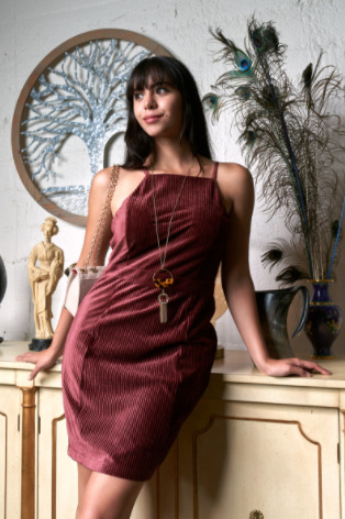 Cranberry red corduroy, sleeveless, square neckline mini dress featuring adjustable shoulder straps, detachable snap button closure belt detail, a back zipper closure, semi-stretch tight fit. Great for your casual, cute, stylish, new fall/winter collection. Made out of 100% Polyester. Available in 3 sizes.