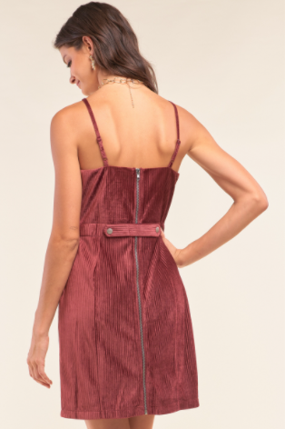 Cranberry red corduroy, sleeveless, square neckline mini dress featuring adjustable shoulder straps, detachable snap button closure belt detail, a back zipper closure, and semi-stretch tight fit.