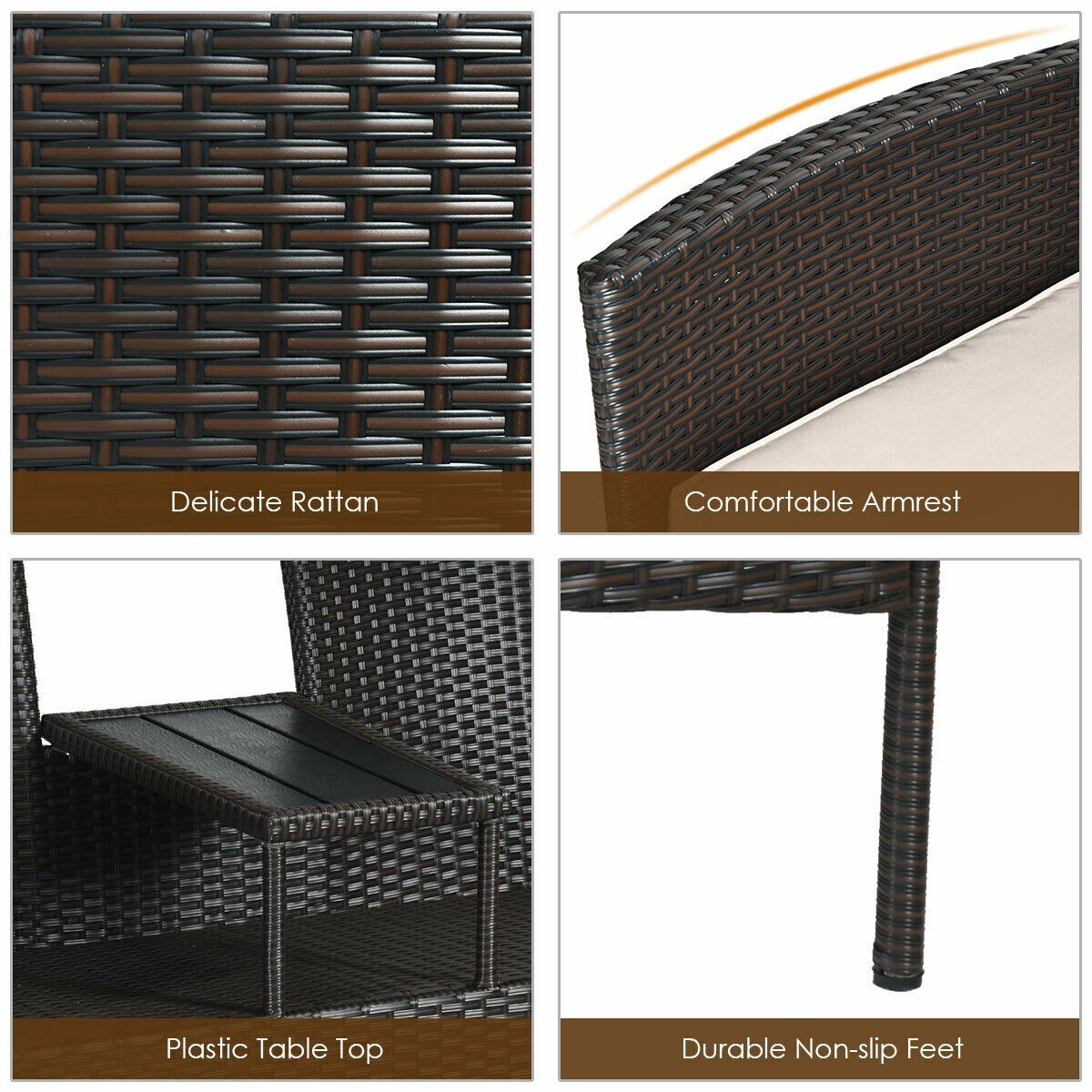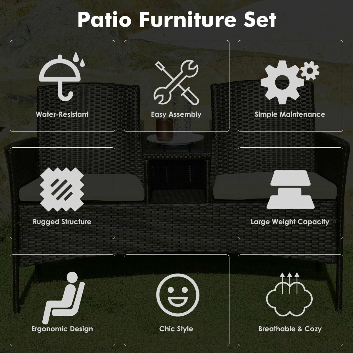 Enjoy outdoor leisure time with this patio conversation set. Featuring rugged structure and high-quality PE rattan, this patio furniture set is built to stand up to harsh weather conditions and great for outdoor using.