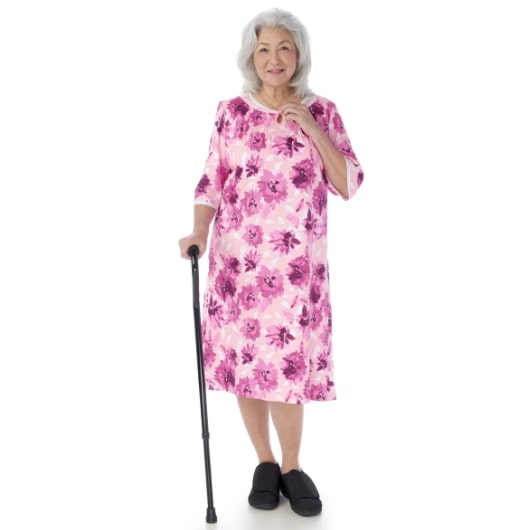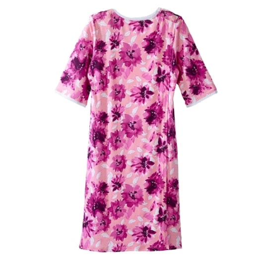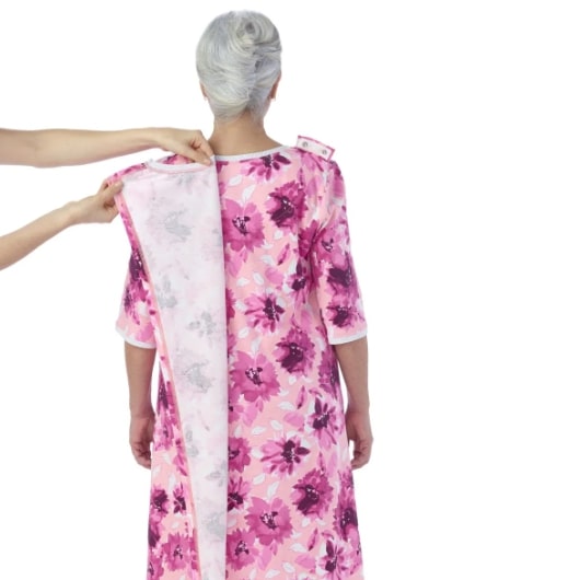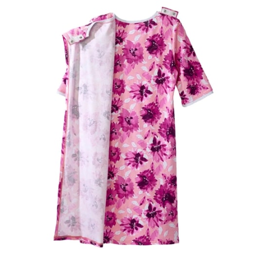 Senior Women’s Open Back Printed Nightgown is ideal for assisted dressing. This nightgown features a discrete and generous back overlap for additional coverage with snap closure at each shoulder for caregivers to easily secure this handicap garment.