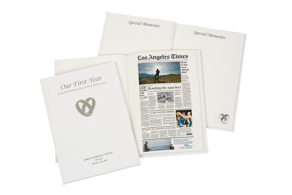 Celebrate a wedding or first anniversary with this beautiful keepsake book. Inside is a digital color reprint of your choice of LA Times or Washington Post newspaper from the wedding day. Plus 24 blank commemorative pages to record key memories of the first year together with photos and other mementos. A unique and bespoke book, beautifully presented with a cream, silver fleck finish, foil embossed with the title, couples names and wedding date. Inside is further personalization with a greeting or message.