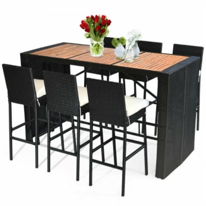 The sturdy steel frame makes this stool strong enough to be your long-term choice. Exquisite rattan and acacia wood surfaces will also give you good touch. The soft sponge cushion can also help to fully relax your body. And the removable cover is convenient for daily cleaning. 6 chairs and 1 table can be used not only for dining but also for entertaining and playing. It is widely used in living rooms, porches, poolside, or gardens.