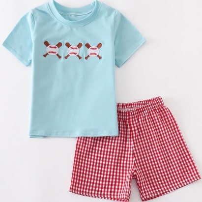 This adorable short sleeve shirt and shorts outfit is perfect for the hotter months with baseball applique. Made out of 95% cotton and 5% spandex.