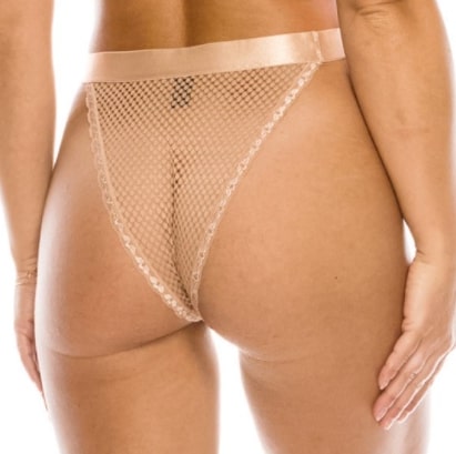 This bikini cut panty features a mesh design and an elastic waistband. Made out of 85% nylon and 15% spandex.