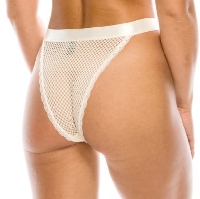 This bikini cut panty features a mesh design and an elastic waistband. Made out of 85% nylon and 15% spandex.