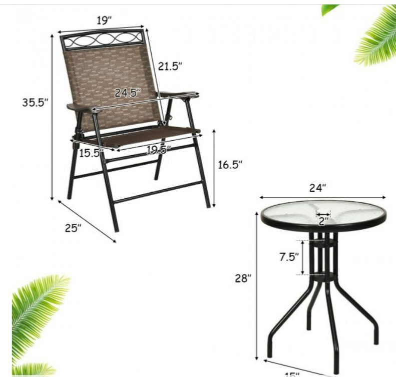 The 3 piece patio bistro set allows you to enjoy leisure time while sunbathing and having a relaxing coffee time.
