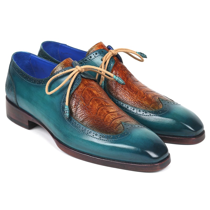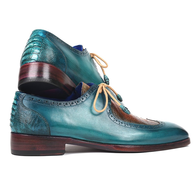 - Brown genuine ostrich leg skin and blue hand-painted calfskin upper.