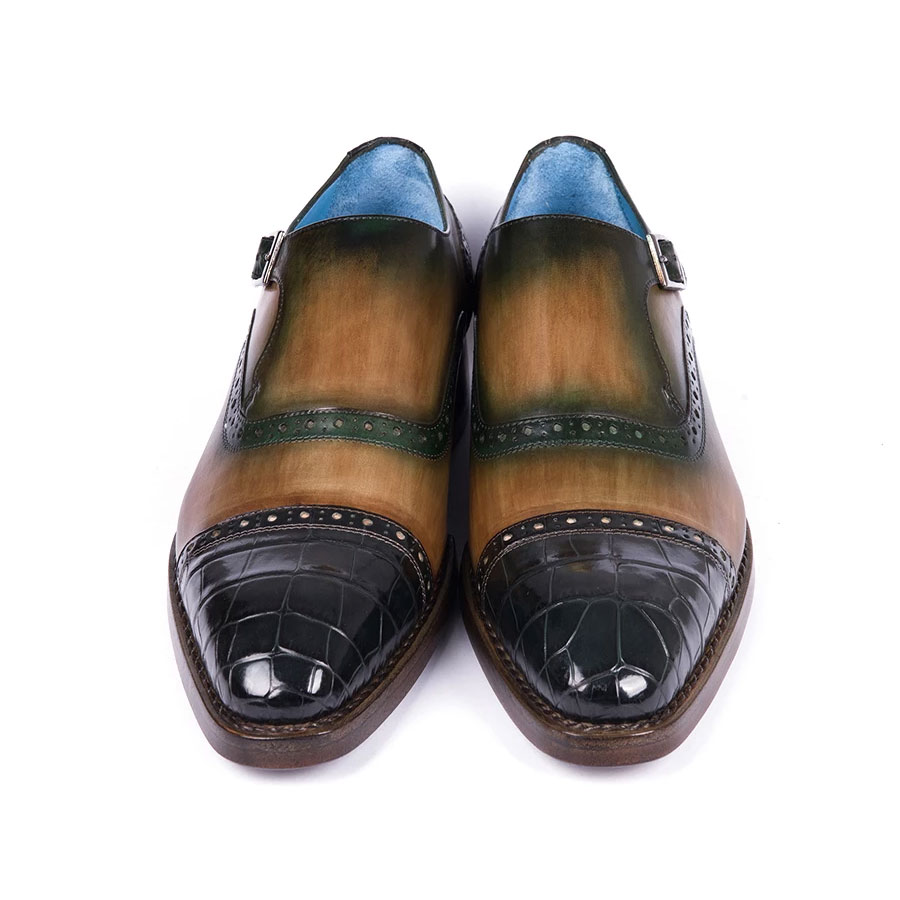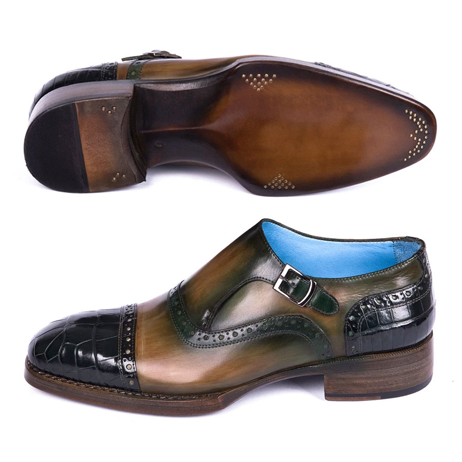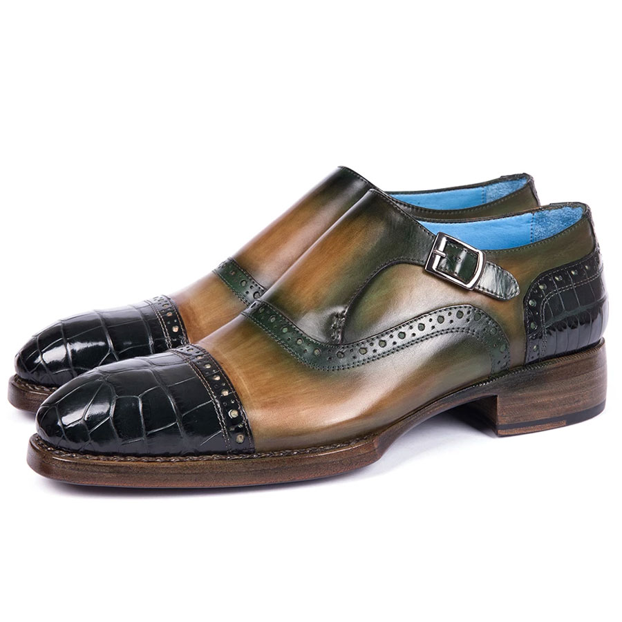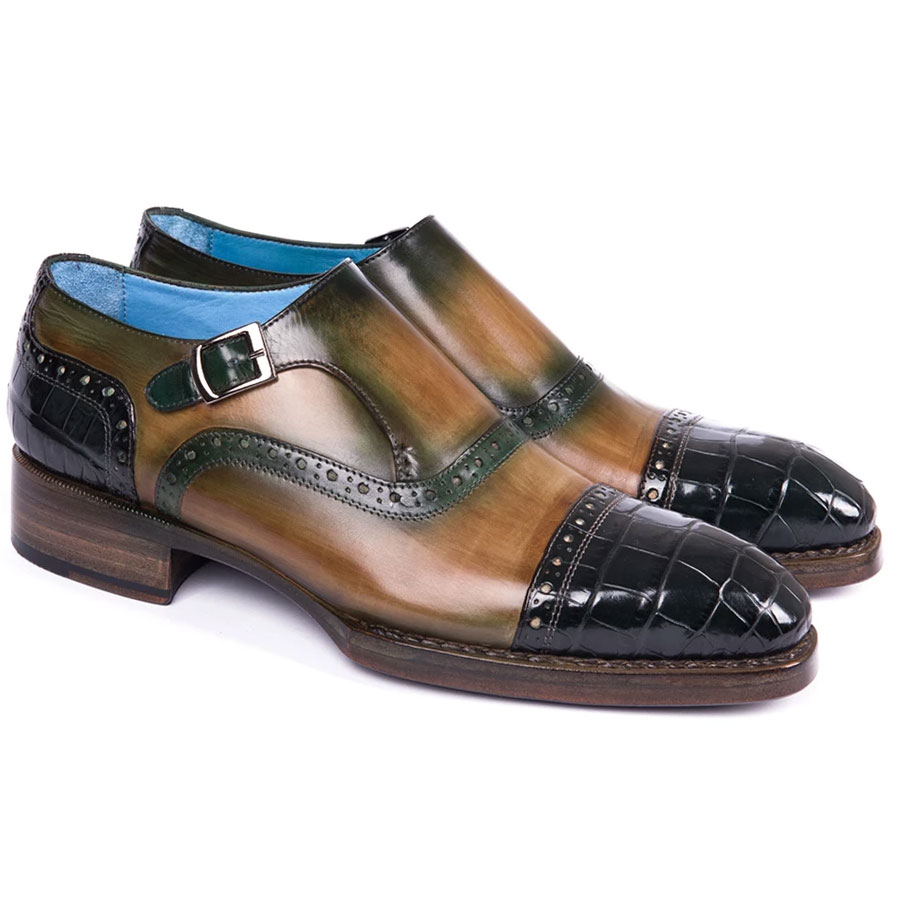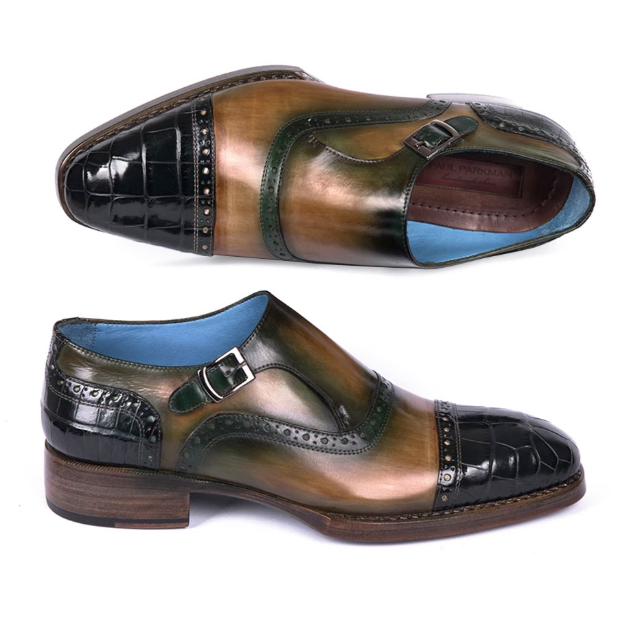 Paul Parkman Green Genuine Crocodile & Calfskin Captoe Monkstrap Shoes (ID#899-GRN)