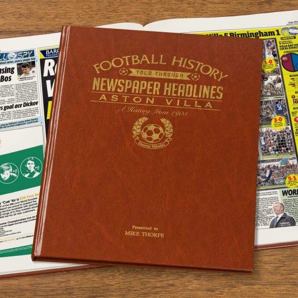 Up the Villa! Capture the history and greatest moments of Aston Villa football club through newspaper articles written at the time. Starting with coverage of Villa’s 1905 FA Cup win, this book charts a glorious history of great games and accomplishments throughout the decades. Top stories include securing the league title in 1910, winning the FA Cup in 1913 for a record fifth time, and again in 1920 and 1957. Read about Aston Villa’s ultimate achievement,when they overcame German giants Bayern Munich to lift the European Cup in 1982. Articles also cover the League Cup victories in 1994 and 1996, and the appointments of Graham Taylor & Ron Atkinson among others, as Villa entered the Premier League, ever-presents until 2016. Newspaper coverage continues right up to the end of last season. A unique and wonderful gift and a must have for all Villa fans, these unique books are reproduced to near full tabloid newspaper size and can be embossed with the recipient’s name. Their name can also be added alongside a personal message on the title page. Size 380X310mm.