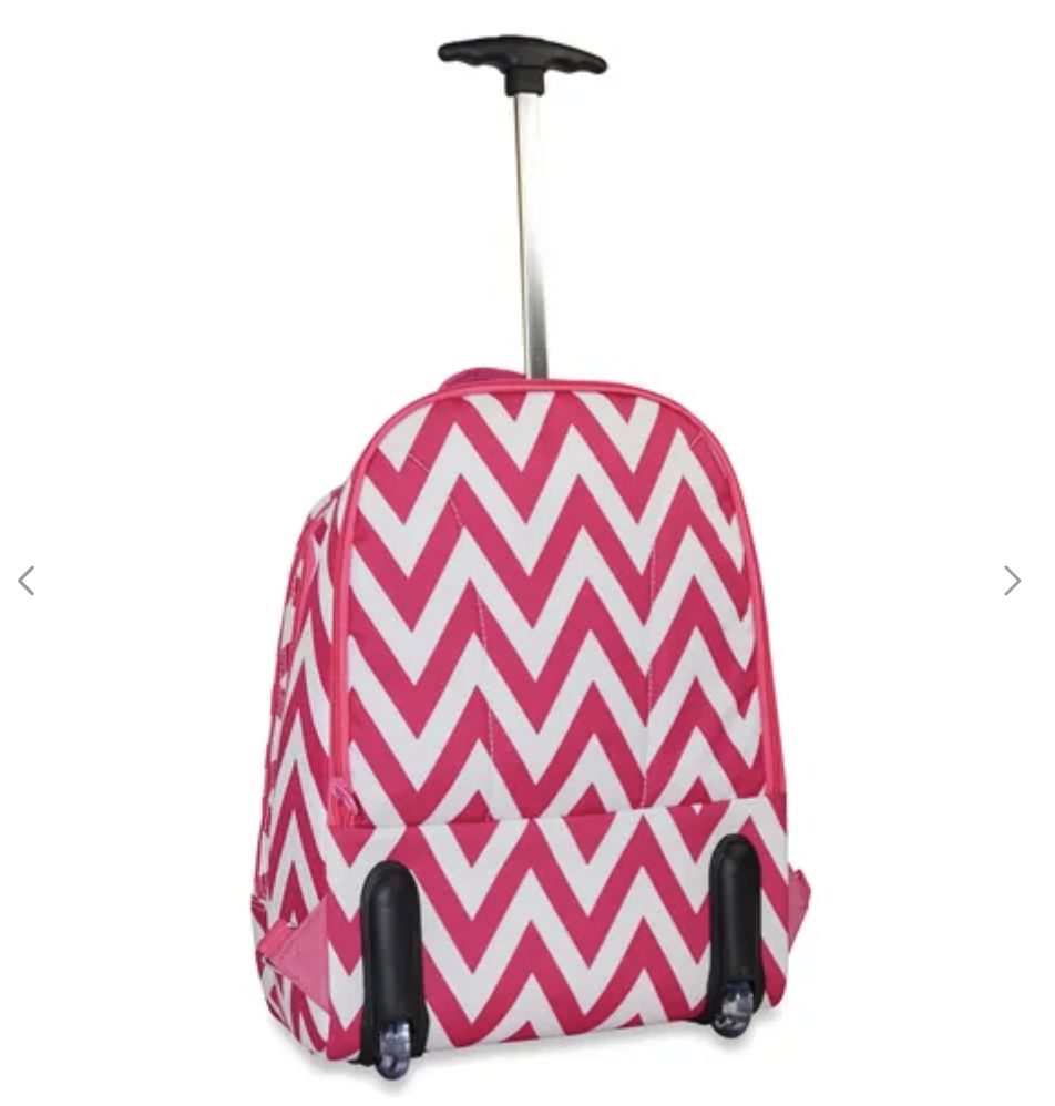 This print laptop backpack  is made with durable 600 denier polyester construction. It has easy glide polyurethane wheels. The telescopic luggage handle also makes this a plausible option as a carry on. One zippered compartment contains a sleeve for a fifteen inch laptop while the other other houses enough room for any peripheral accessories or personal belongings. It’s the perfect travel companion.