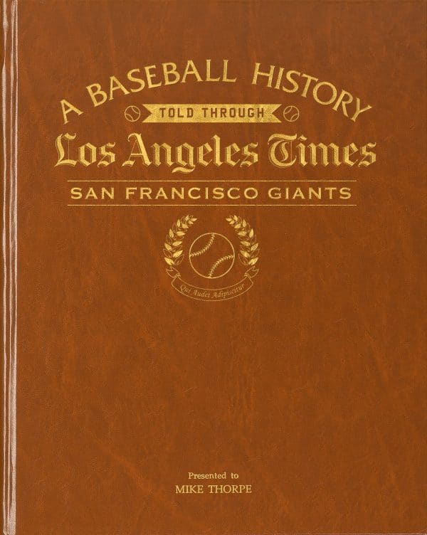 Capture the history and greatest moments of the San Francisco Giants through LA Times newspaper articles written at the time. This book is unique and makes a wonderful gift, the perfect for any proud Giants fan, with newspaper coverage beginning in 1905 when the Giants (then based in New York) won their first World Series. Reports then follow to cover more triumphs after their move to San Francisco, including nine National League pennants in 1904/05, 1911-13, 1917 and 1921-24, and two further World Series in 1921 and 1922. With a proud history, articles cover more than just the wins and losses, inside you’ll also find coverage of Barry Bonds record-breaking home run season of 2001 and his historic moment in 2007 when he hit his 756th home run to pass Hank Aarons record. Reproduced to near full tabloid newspaper size it is bound in luxury tan leatherette, gold embossed, hardback cover. Further personalization can include a message from you on the title page.