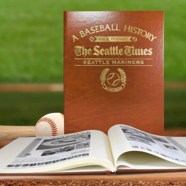 Capture the history and greatest moments of the Seattle Mariners through Seattle Times newspaper articles written at the time. Beginning with coverage from 1976, this book follows triumphs of proud Mariners history through newspaper articles. Coverage includes the first no-hitter in Mariners history by Randy Johnson against the Detroit Tigers in 1990, also read all about Sellout crowd in 2007 at Safeco Field to celebrate the wonderful life and career of Ken Griffey Jr. This book is a unique and wonderful gift, the perfect for any die-hard Mariners fan. Reproduced to near full tabloid newspaper size it is bound in luxury tan leatherette, gold embossed, hardback cover. Further personalization can include a message from you on the title page.