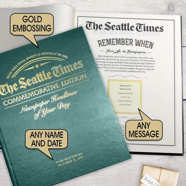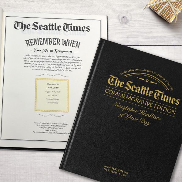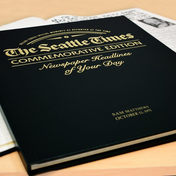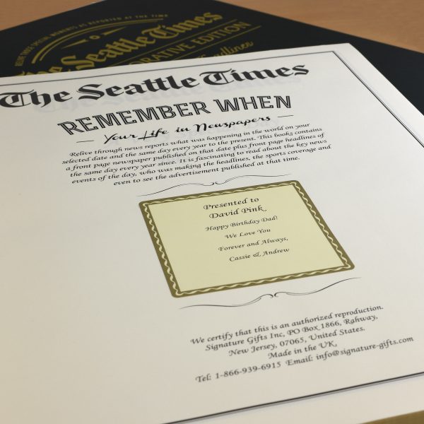 The perfect personalized gift for a special occasion. This special edition newspaper book features exact reproductions of The Seattle Times articles chronicling the news and major events from your chosen date. Inside is the headline from the selected date plus front pages from all birthdays or anniversaries every subsequent year. This unique tabloid size book is also extra-special because it features blank pages between each front page, ready to be filled with photos and messages of your choice. The front cover comes in your choice of black, luxury leather or deep green leatherette, and inside the newspaper book’s title page includes a certificate where you can add a personal message up to 150 characters and a full name (22 characters). Please note: If for any reason a newspaper does not exist for a particular date (it’s a day on which newspapers weren’t published or it occurred during a strike) the following day’s front page will be used. Total page count varies depending upon year selected; final front page will be from previous year.