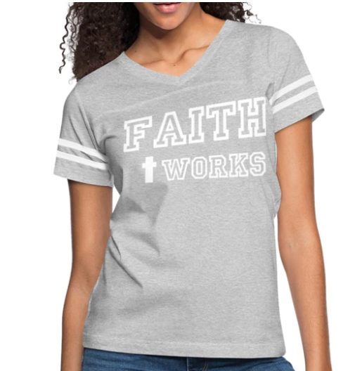 Short Sleeve T-Shirt “Faith + Works ” Graphic Vintage Sport Design In Heather Gray White