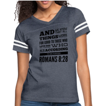 Women’s Short Sleeve T-Shirt, Romans 8:28 Vintage Sport Graphic Tee. Straight from the pages of yesteryear comes this style-refined vintage T-shirt. The poly-cotton blend makes for an incredibly soft and comfortable wear, and added features such as the EasyTear™ label and double-needle stitching ensure a durable and fashionable wear for years to come.