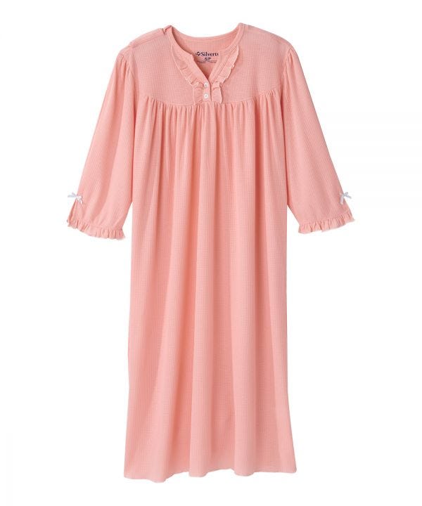 Senior Women’s Open Back Nightgown is ideal for assisted dressing. This nightgown features a discrete and generous back overlap for additional coverage with snap closure at each shoulder for caregivers to easily secure this handicap garment. This nightgown also features small ruffle details at the center front placket and sleeves as well as delicate bows for an added feminine touch and a super soft waffle knit fabrication for all-day comfort.