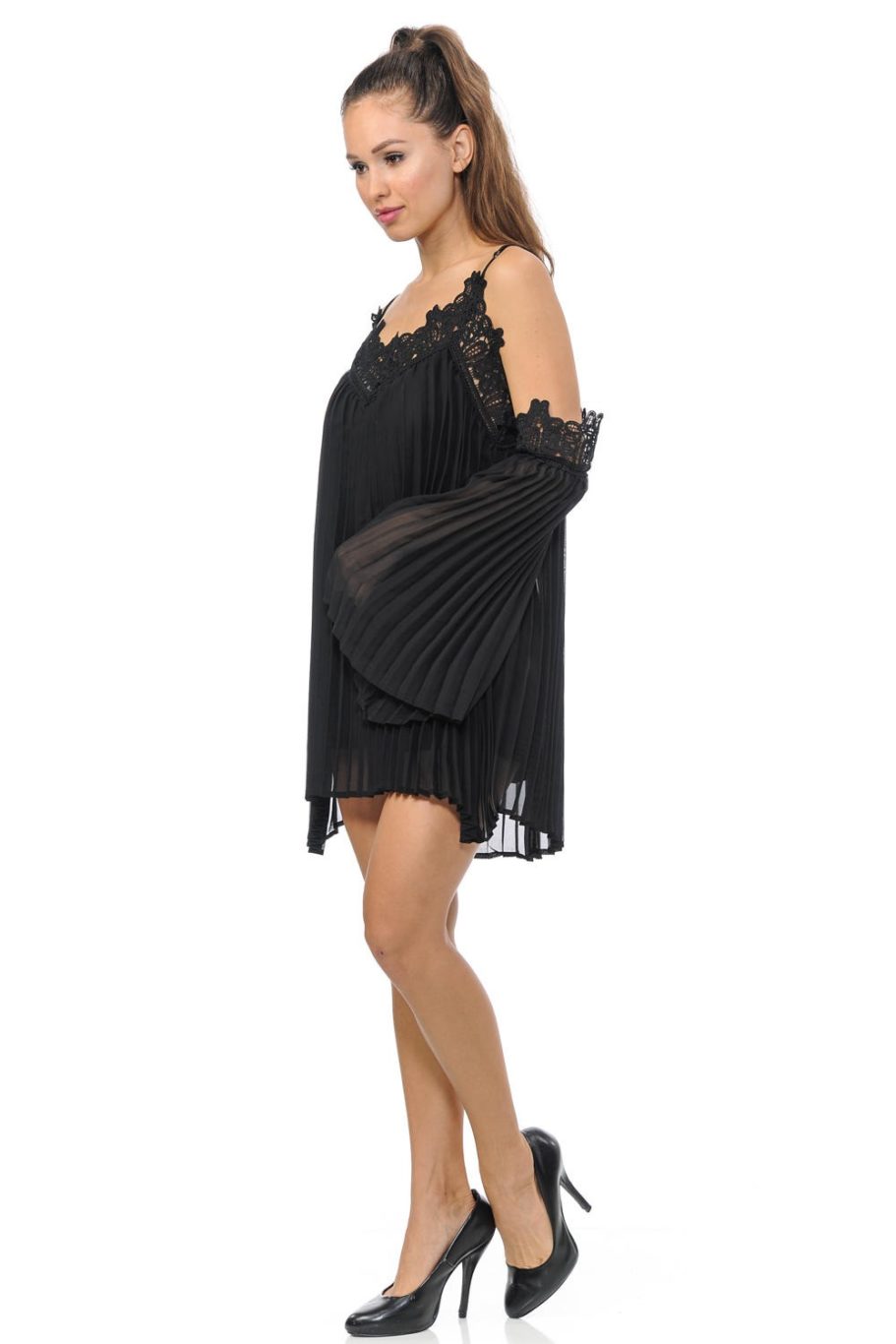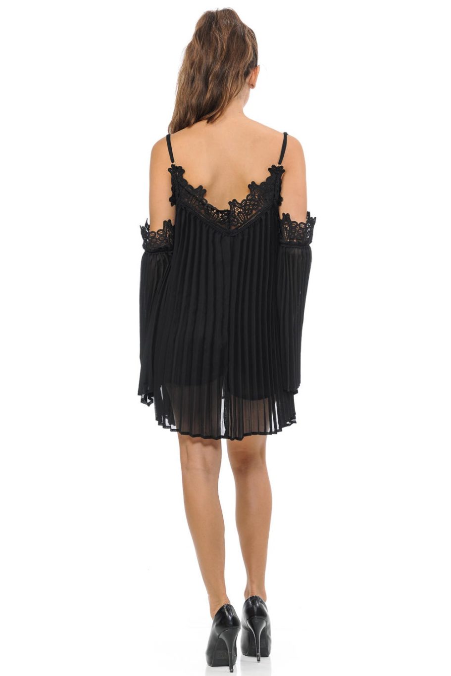 -Over the knees length. Two in one garment: Optional long sleeve with bare shoulders. Lace details at the neck and sleeves