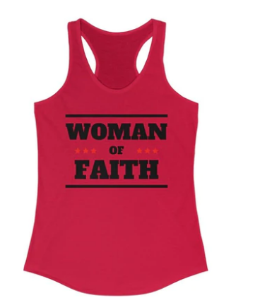Tank Top Flowy Racerback “Woman Of Faith” (Black Text) Graphic In Solid Red
