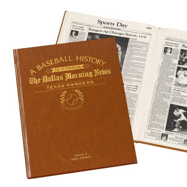 Capture the history and greatest moments of the Texas Rangers through Dallas Morning News newspaper articles written at the time. Starting back in 1971 this comprehensive history includes top stories such as their triumphant doubleheader vs. California Angels, 7-1, 8-0. Covering such fantastic moments such as 300th Milestone win for top player Nolan Ryan, this book is sure to please any Rangers fan. Reproduced to near full tabloid newspaper size it is bound in luxury tan leatherette, gold embossed, hardback cover, to which a name is added. Further personalization can include a message from you on the title page.