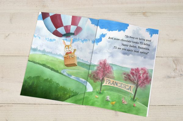 The perfect gift for a little one at Easter time is this personalized Easter Bunny Story book. The story tells in rhyme how the Easter Bunny produces and delivers chocolate eggs at Easter. Starting in Bunny Land with its chocolate waterfall and candy butterflies, the story includes 10 beautiful, hand-painted colored illustrations that each include the child’s name. The name also appears on the 8 x 11” book’s front cover and on the title page with your personalized message.