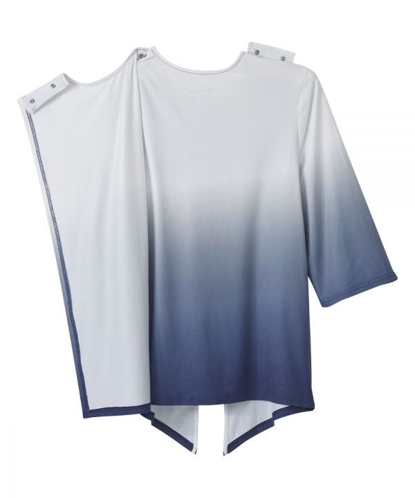Senior Women’s 3/4 Sleeve Ombre Knit Twofer Top features a discrete and generous back overlap for additional coverage with snap closure at each shoulder for caregivers to easily secure this handicap garment.