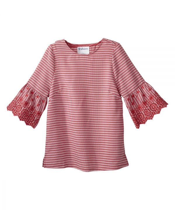 Senior Women’s Gingham Embroidered Top features a discrete and generous back overlap for additional coverage with snap closure at each shoulder for caregivers to easily secure this handicap garment. This top has a stylish 3/4 embroidered lace flounce sleeve hems for a perfect casual stylish look.