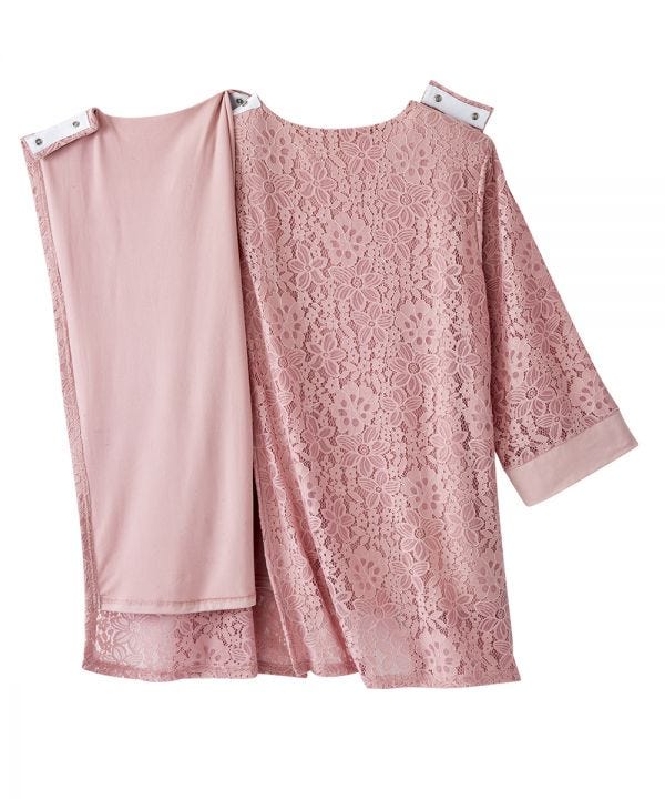 Senior Women’s Twofer Lace Blazer features a discrete and generous back overlap for additional coverage with snap closure at each shoulder for caregivers to easily secure this handicap garment.