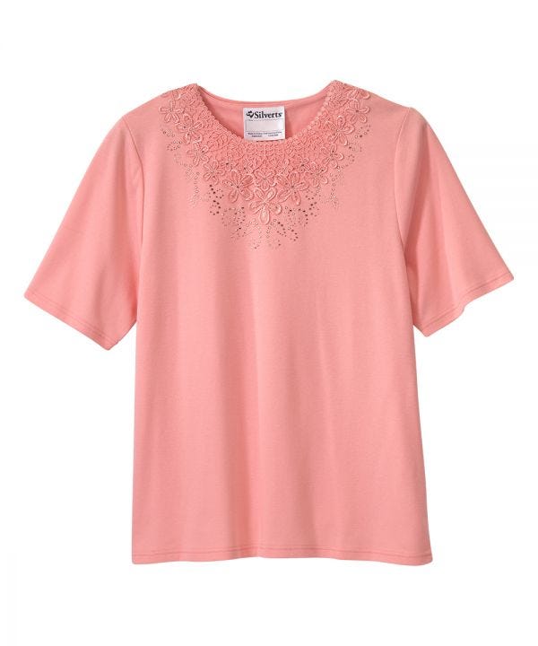 Senior Women’s Rhinestone Embellished Top features a discrete and generous back overlap for additional coverage with snap closure at each shoulder for caregivers to easily secure this handicap garment. This classic top has an elevated summer lace appliqué beautifully crafted with rhinestone around the neckline.