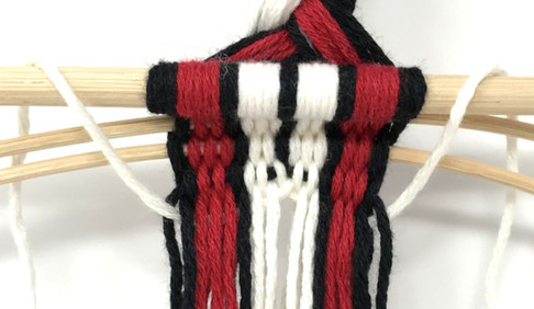 In finger weaving, a vertical “warp” yarn on one side becomes a horizontal weaver “weft” yarn as it passes through the shed to create a design. Once you learn the technique of finger weaving you can make other designs, different sizes, using all kinds of yarn types and weights.
