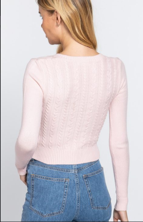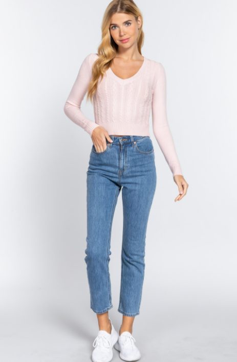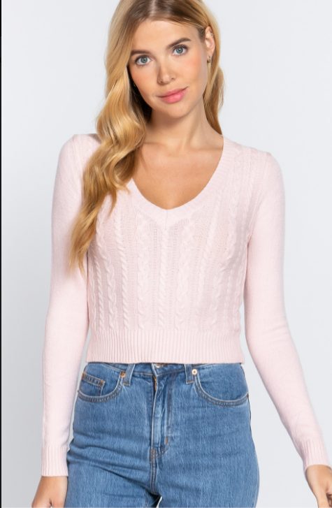 This simple cable knit v-neck sweater is just in time for cooler weather. Fitted long sleeves and a beautiful cable knit design. Pair with your favorite Fall fashion attire!