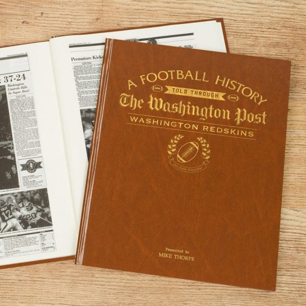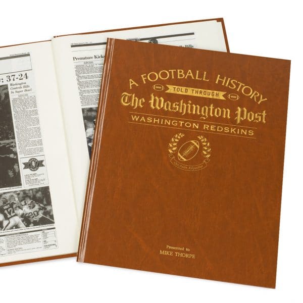 This book follows the Redskins, through Washington Post newspaper articles, from their relocation from Boston in 1937 and begins with the team’s 13-3 win over the Giants, later that same year the Skins beat the Giants again for the Eastern title before triumphing over the Bears to secure their first Championship. With Super Bowl wins also covered by numerous newspaper articles, this book is the place to find the most memorable moments of Skins history. This is a unique and wonderful gift and a must have for every Redskins fan. Reproduced to near full tabloid newspaper size it is bound in luxury tan leatherette, gold embossed, hardback cover. Further personalization can include a message from you on the title page.